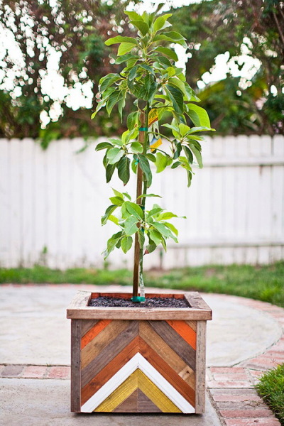 Несколько оттенков краски и кисточка в умелых руках могут превратить деревянную цветочную кадку в настоящее произведение искусства. Чем ярче и контрастнее краски, тем неожиданнее получается результат.