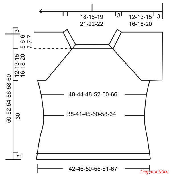 Вязать петли по рисунку. В первом круге начинаем делать прибавки Реглана – см. Описание узоров. Сделать прибавки только на переде и спинке возле каждого маркера реглана. Прибавить по 2п в каждом втором круге 9-9-8-10-12-13 раз, затем прибавить по 1п в каждом втором круге 2-4-6-6-8-8 раза = 224-244-250-282-316-328п. ПОМНИТЕ О ПЛОТНОСТИ ВЯЗАНИЯ! Продолжить вязать петли по рисунку до высоты 12-13-15-16-18-20 см от маркера. Кокетка закончена. Затем вязать крайние петли переда и спинки как рукава. Следующий ряд: провязать первые 30-33-37-41-47-50п, снять следующие 50-54-54-62-66-66п рукава на держатель петель и набрать 6-6-10-10-10-14п (= подрез рукава), провязать следующие 62-68-71-79-92-98п (= перед), снять следующие 50-54-54-62-66-66п рукава на держатель петель и набрать 6-6-10-10-10-14п (= подрез рукава), провязать оставшиеся 32-35-34-38-45-48п. Далее нижнюю часть и рукава закончить раздельно. ВСЕ ИЗМЕРЕНИЯ БУДУТ ДЕЛАТЬСЯ ОТ ДАННОГО МЕСТА!