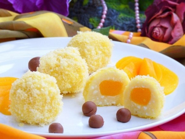 4. Из творожной массы сформовать шарик, затем приплюснуть его в лепешку, в серединку положить персик.