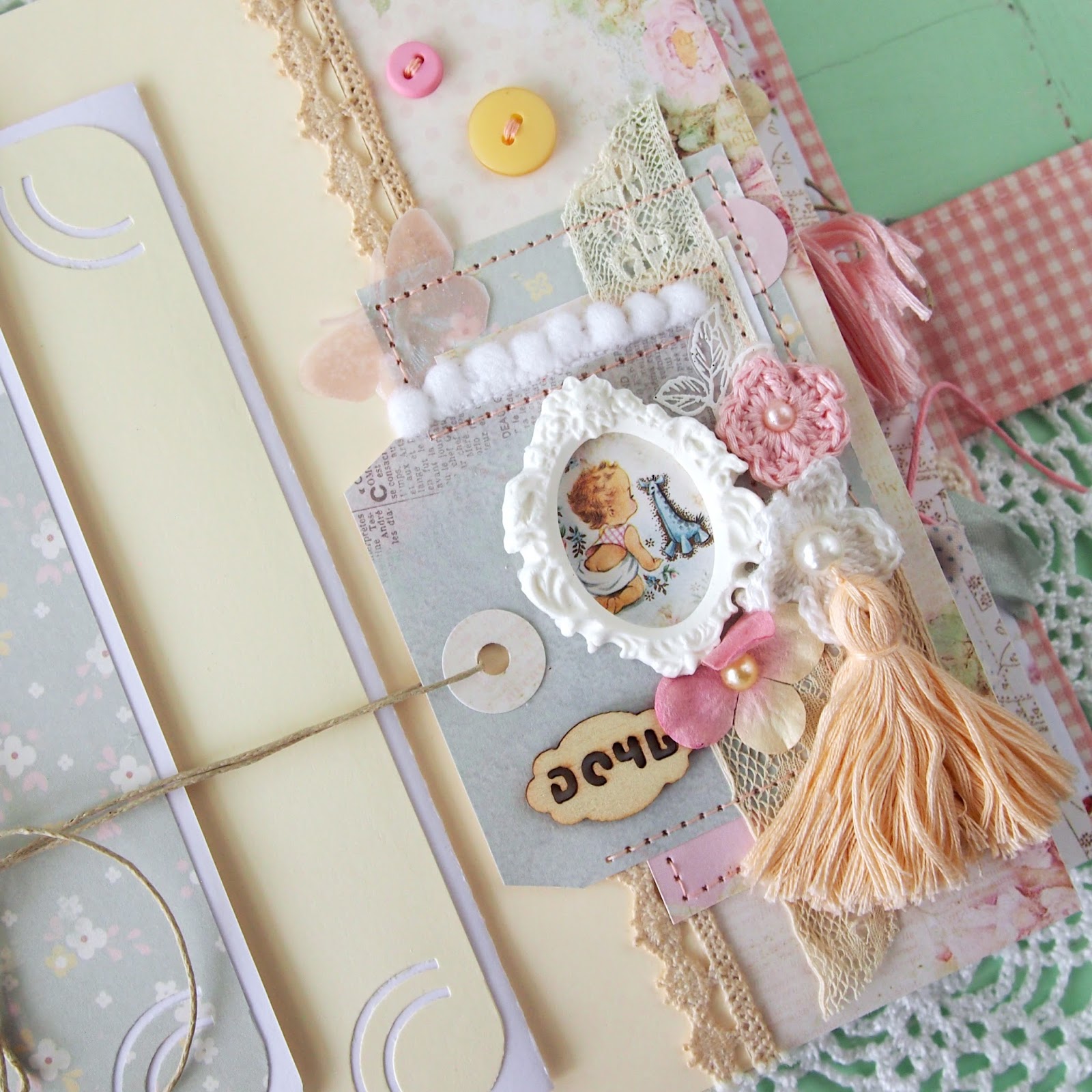 Чтобы поддержать и дополнить всю нежность и уютность этой бумаги , я использовала очень много украшений, созданных своими руками. Это рюши из фатина, вязаные цветы, пинетки, обвязанные картинки (вырезанные из листов бумаги), обтянутые тканью пуговки, кисточки из ниток, тканевые цветы и т.д.