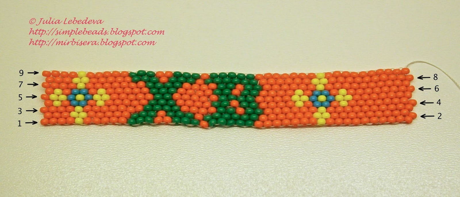 1 ряд - одинарная цепочка, состоящая из 42 бисеринок: 4 оранжевые, 1 жёлтая, 5 оранжевых, 3 зелёные, 2 оранжевые, 3 зелёные, 1 оранжевая, 5 зелёных, 7 оранжевых, 1 жёлтая, 10 оранжевых.