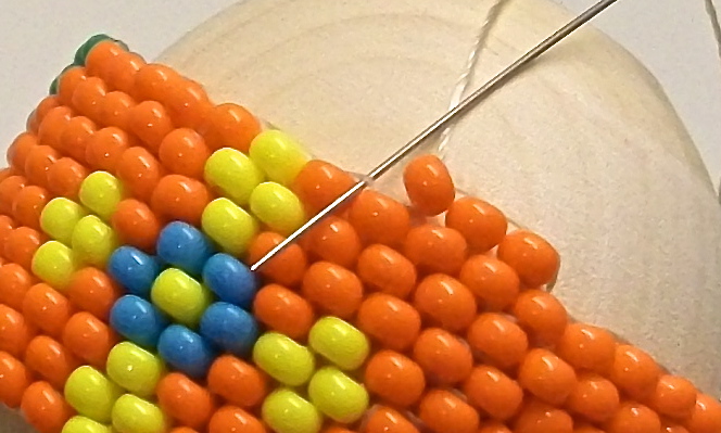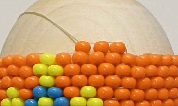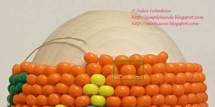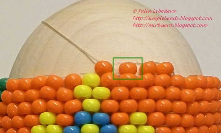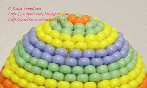 При оплетении верхушек каждый новый ряд я делала однотонным, меняя цвет бисера каждые два ряда. Первые два новых ряда у меня оранжевые, два следующих ряда - жёлтые, ещё два следующих - салатовые и т.д.