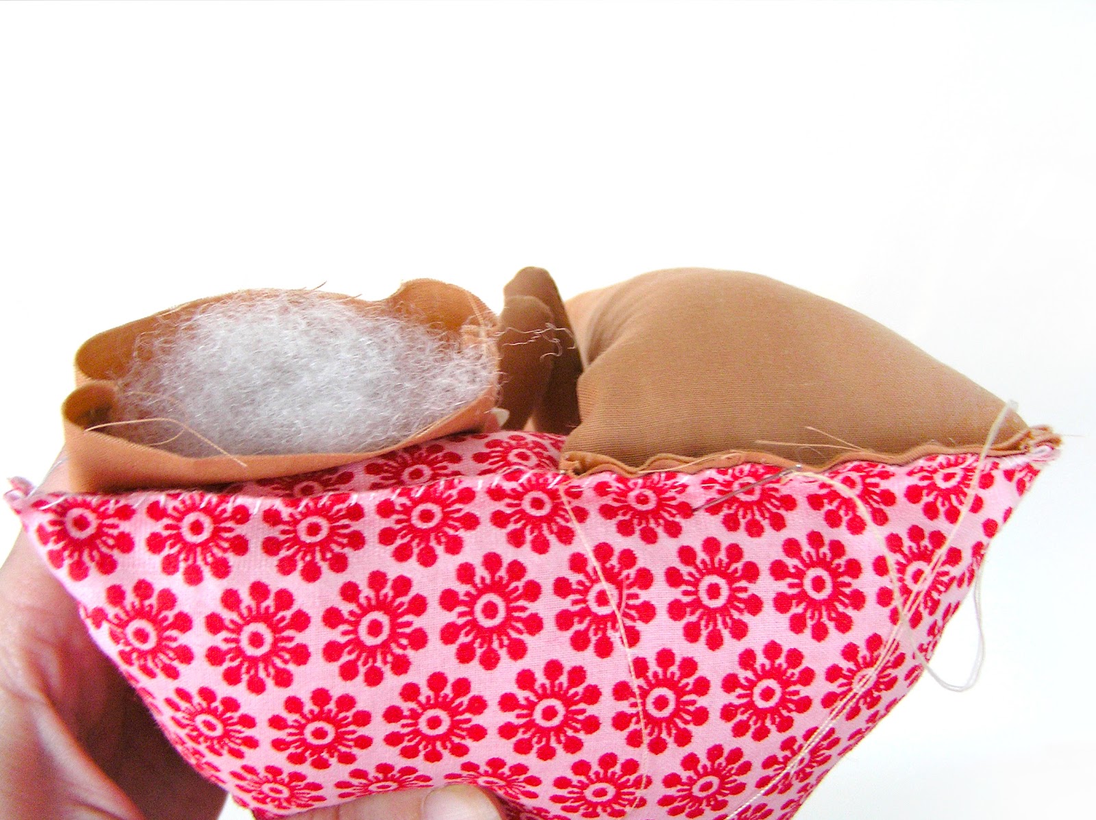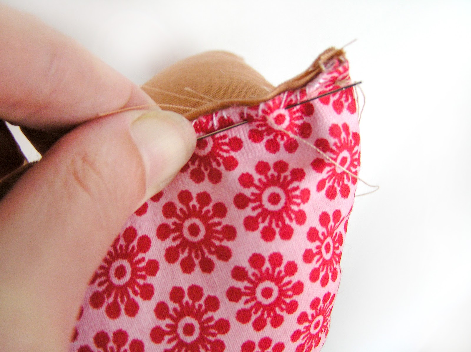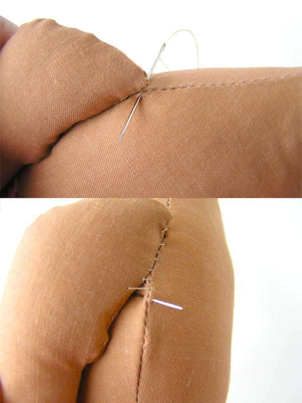 Руки. Края отверстия, через которое набивали, подворачиваем внутрь (на выкройке отмечено линией, сколько подвернуть, но можно и на глаз) и зашиваем потайным швом или "через край" очень-очень короткими и мелкими стежочками.