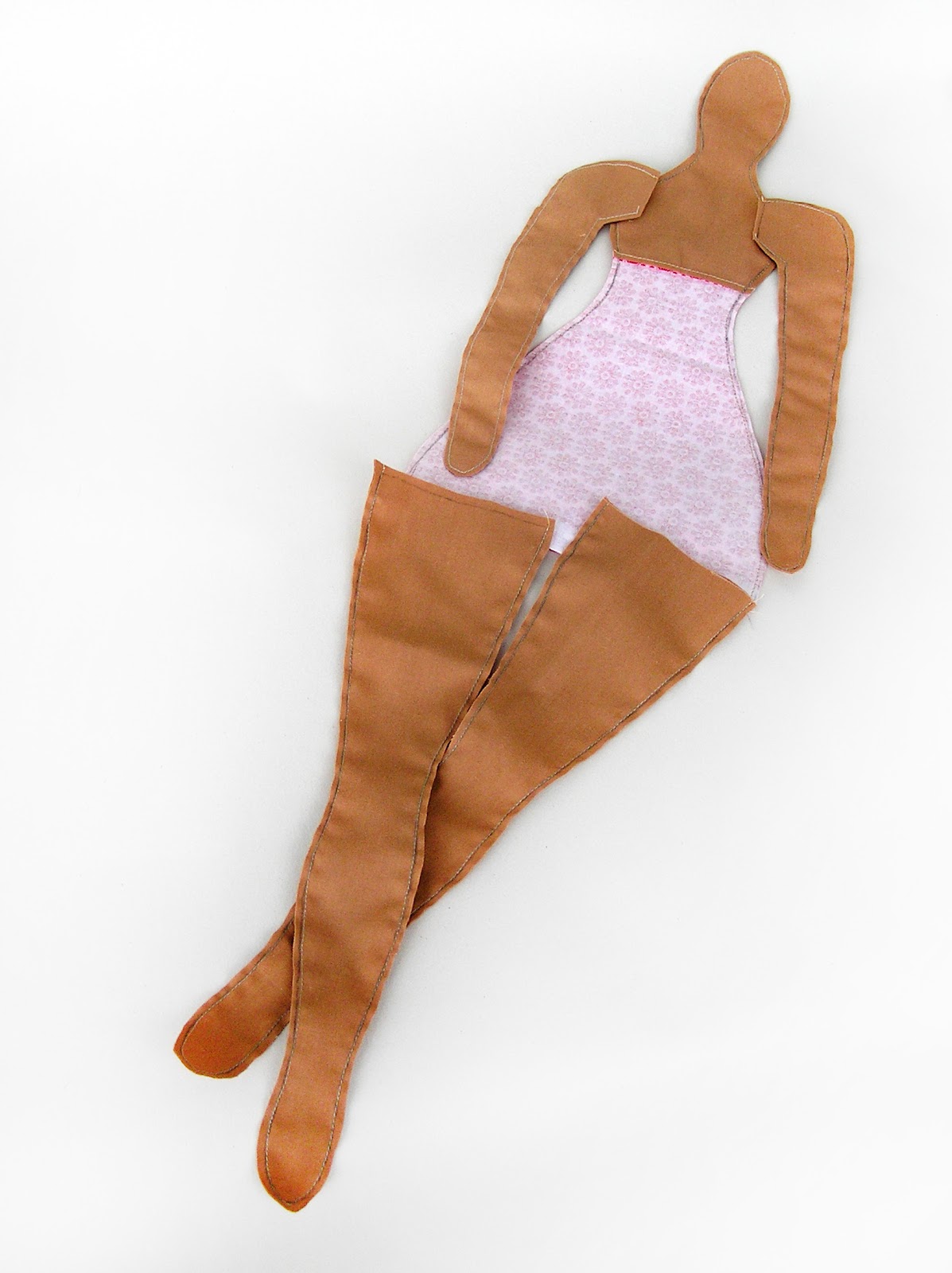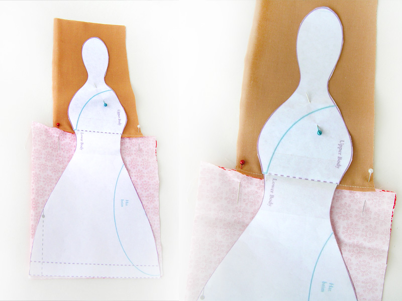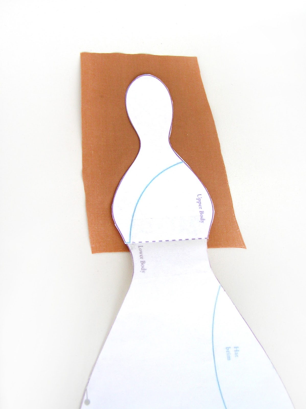 4. Теперь туловище. Оно у нас составное из двух тканей. Ради экономии драгоценного материала, я делаю следующим образом. Беру телесную ткань и вырезаю кусочек, в который с запасом помещается верхняя "телесная" часть выкройки - до пунктира. Не забываем, что нам надо два таких кусочка - для переда и зада тильды.