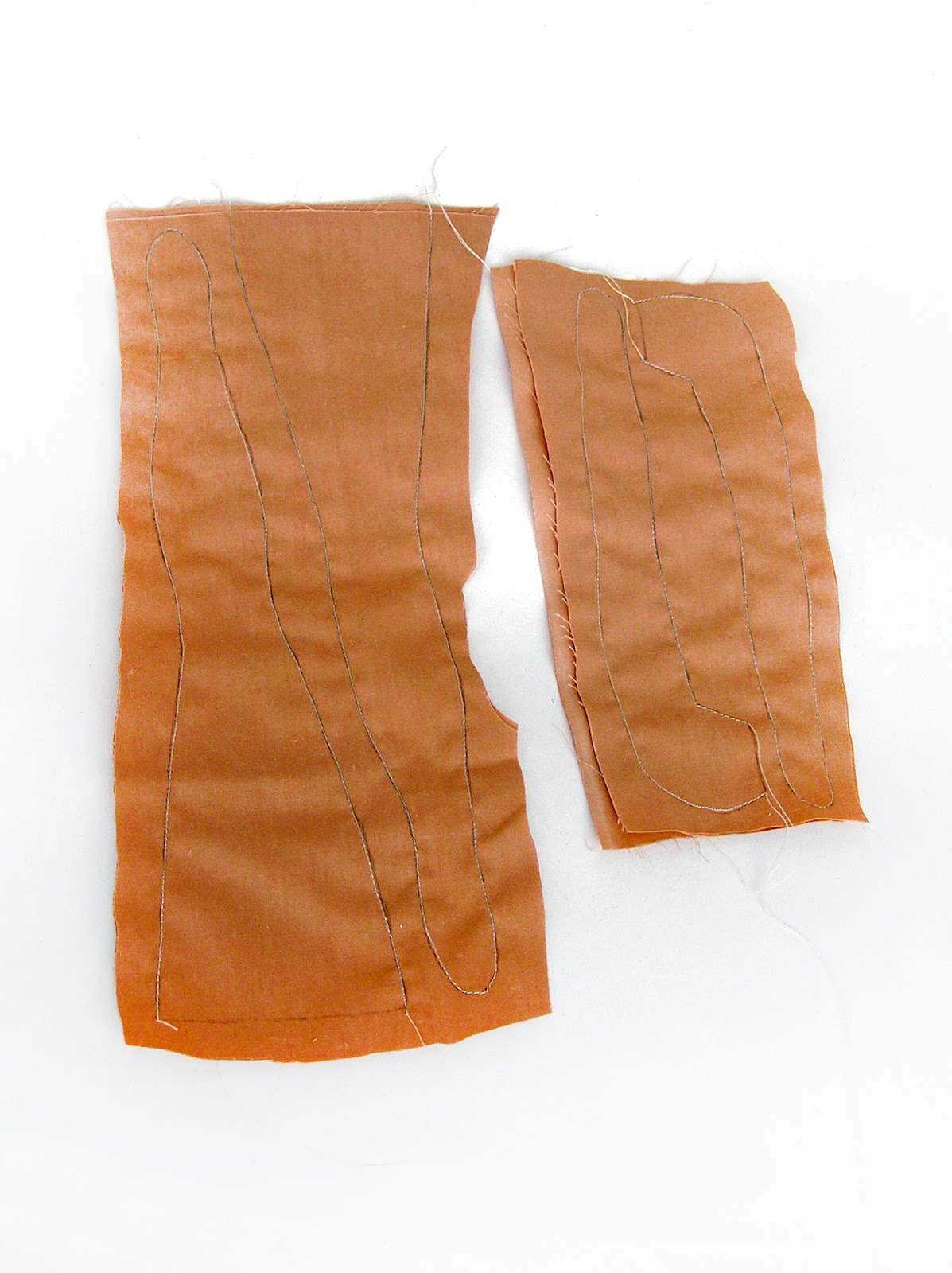 3. Начинаем с тела. Берём телесную ткань (у меня цвета загара). Переносим выкройку на ткань (с помощью исчезающего маркера или как я - обводим детали простым карандашом). Сначала руки и ноги, по две штуки каждых )))))))))))). Прострачиваем мелким стежком или сшиваем вручную - крепко, стежки мелкие. Не забываем оставить не зашитое отверстие для выворачивания и набивания.