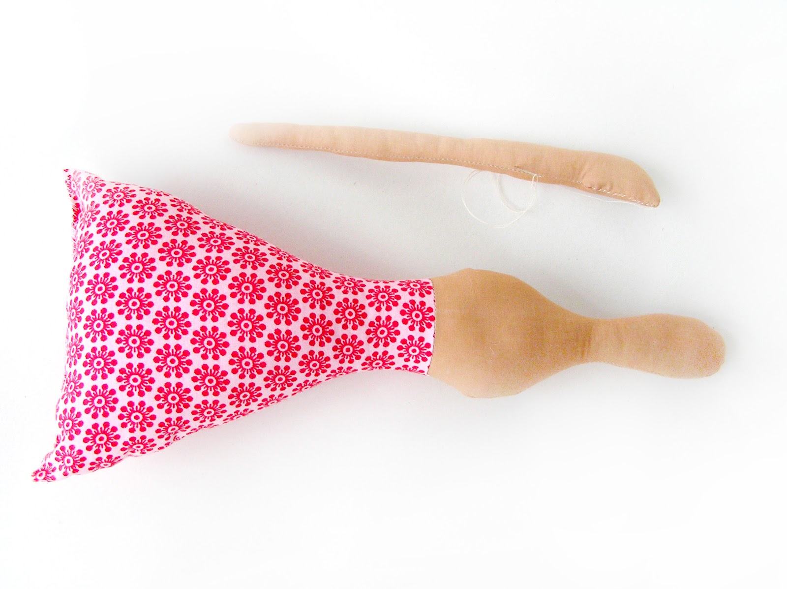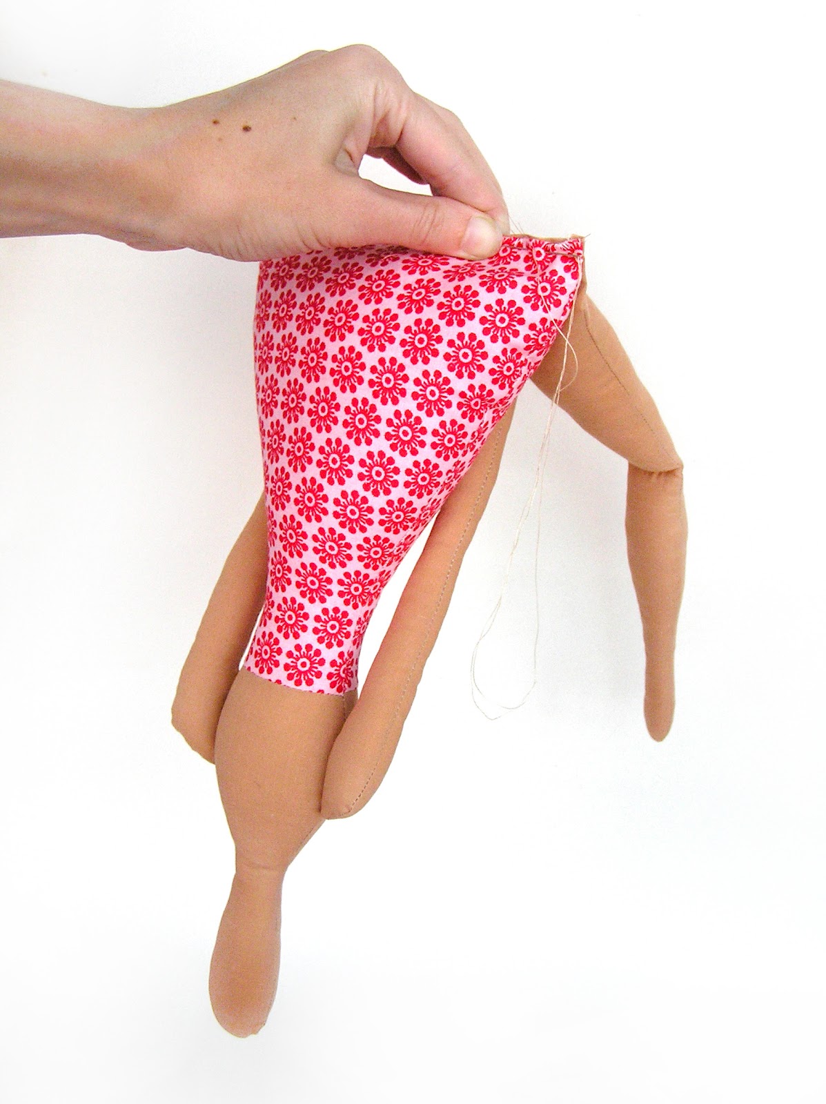 Не забываем убедиться, что ноги выходят одной длины! Пришиваем от середины ко второму краю туловища.