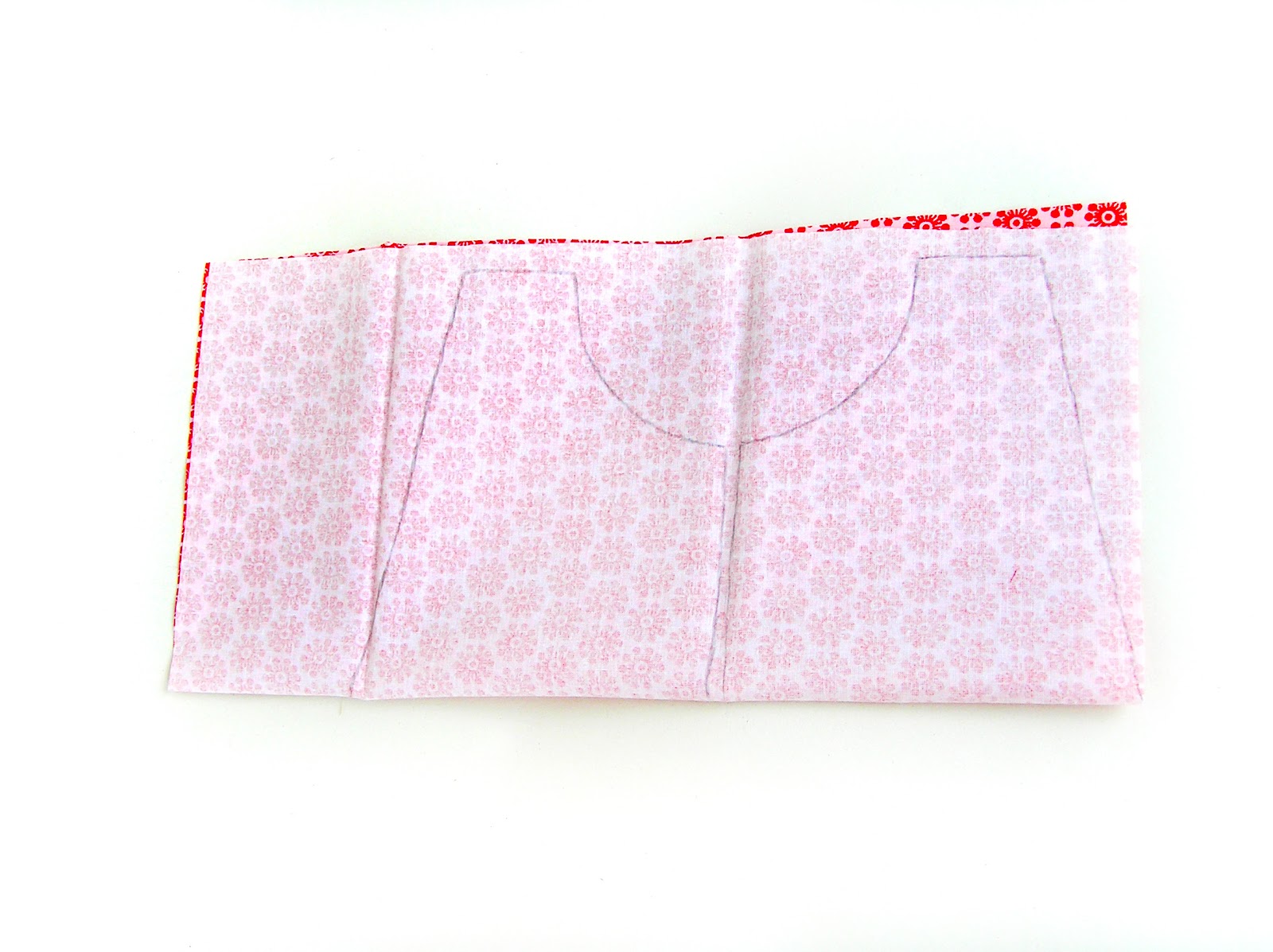 Складываем обе получившиеся половинки будущего тела лицевыми сторонами (лицо должно оказаться внутри, швы наружу). Скалываем булавками, тщательно совмещая шов (тот, который соединяет цветной и телесный лоскуты) на обеих половинках.