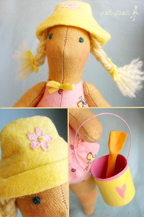 Ведерко из обрезанной жестяной баночки, покрашено, ручка из проволоки, а лопатку слепила из пластики. Купальник тоже из фланельки. В уточку :))