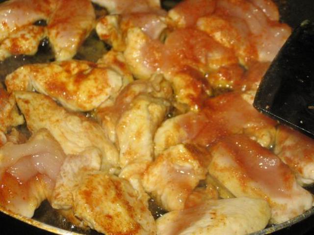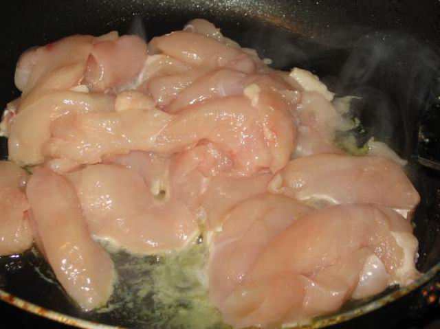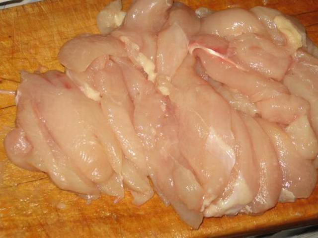 Начинаем с разделки куриного филе. Его моем, режем на тонкие длинненькие кусочки,