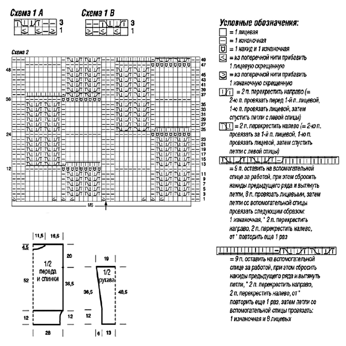 Полоса из «кос» А (вначале на 3 петли). Вязать по схеме 1 А, на которой даны лицевые ряды. В изнаночных рядах петли провязывать по рисунку.