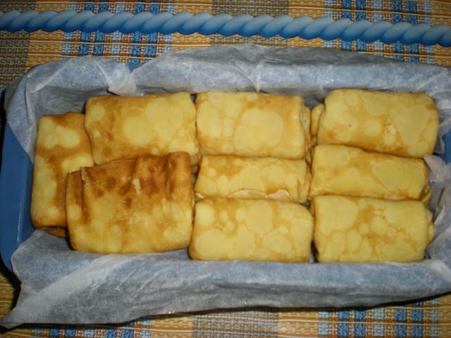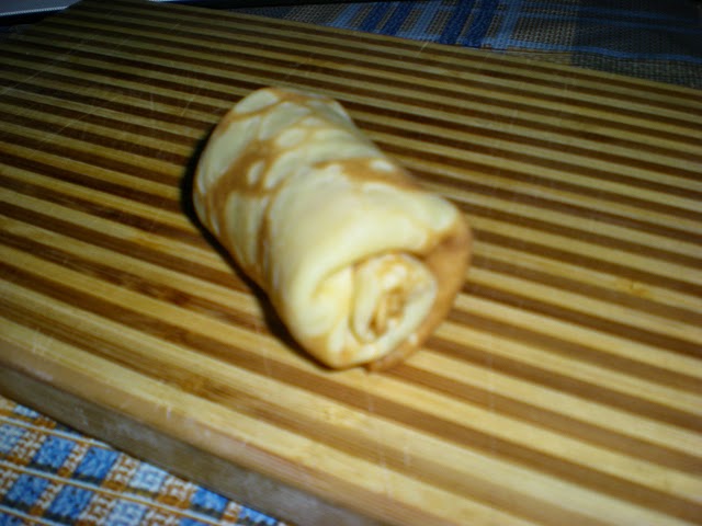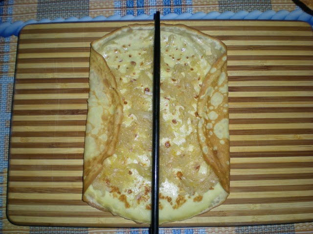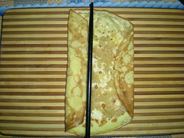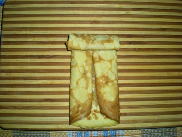 Я сворачивала рулетики. Разделить мысленно блинчик пополам. Загнуть края на половину каждой стороны.