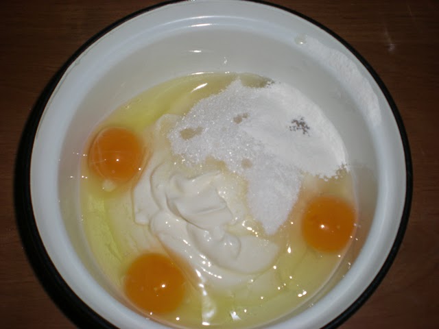 3 яйца, сметану, ванильный сахар, 2 столовых ложки муки и 70 г сахара  смешать до однородности.