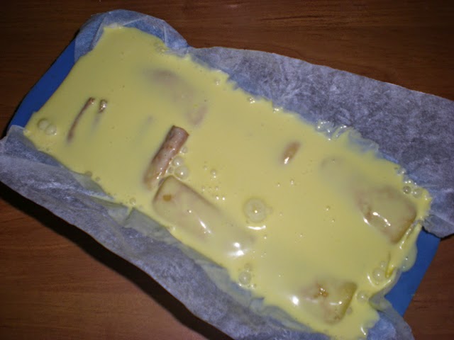 Выложить эти рулеты в форму. Я застелила бумагой для выпечки для того, чтобы удобно было доставать пирог из формы.