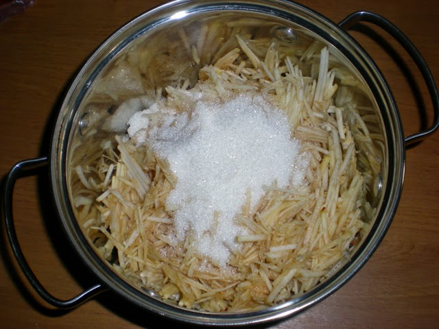 Яблоки почистить и удалить сердцевинки. Натереть яблочную мякоть на крупную терку. Я использовала терку Бернера.