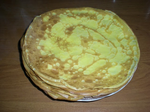 Для приготовления блинов, 3 яйца разбить в мисочку и взбить с солью и ложкой сахара при помощи венчика. Влить молоко и еще раз взбить. Влить растительное масло и постепенно ввести просеянную муку (1 стакан). Замесить однородное блинное тесто и испечь тонкие блинчики.