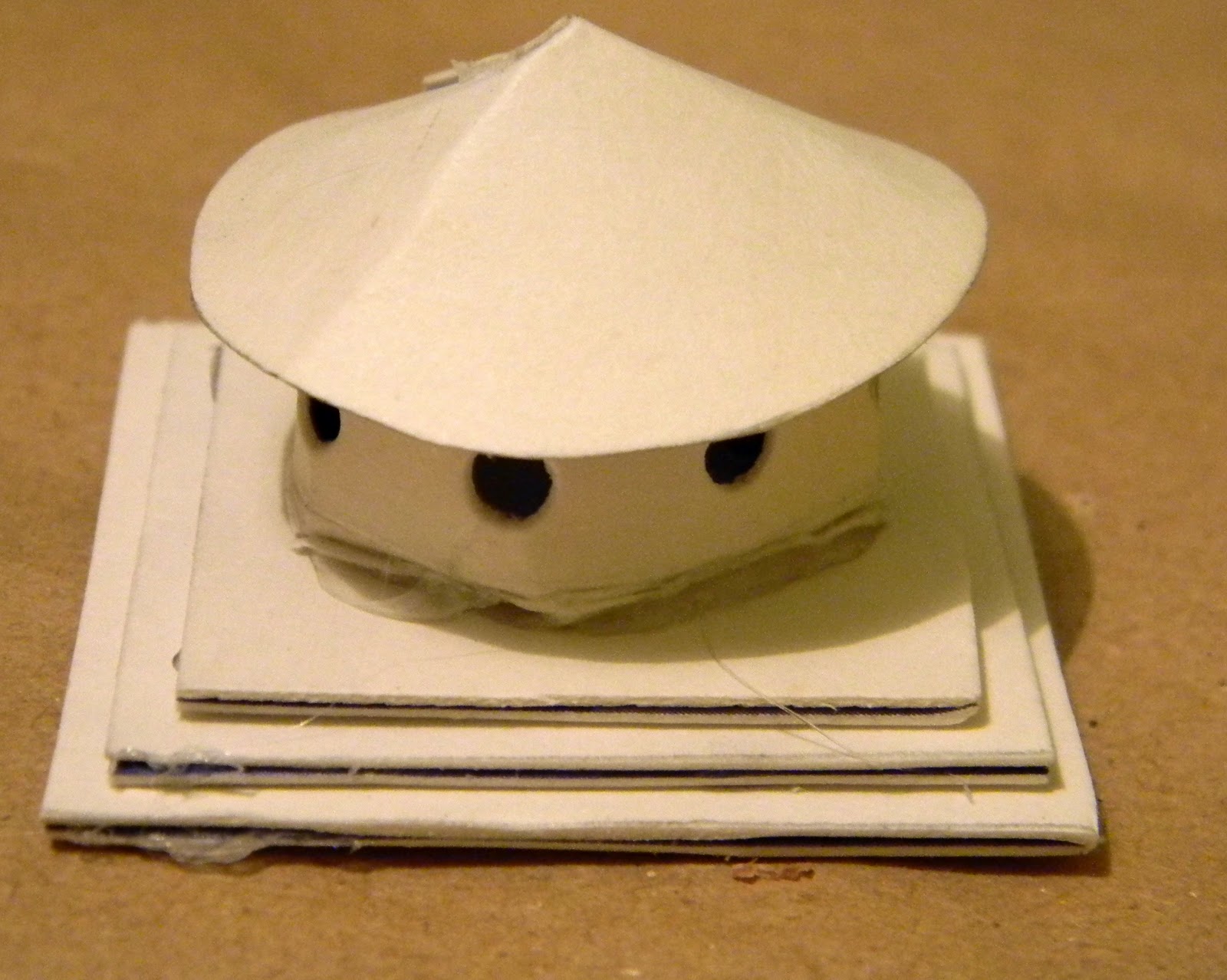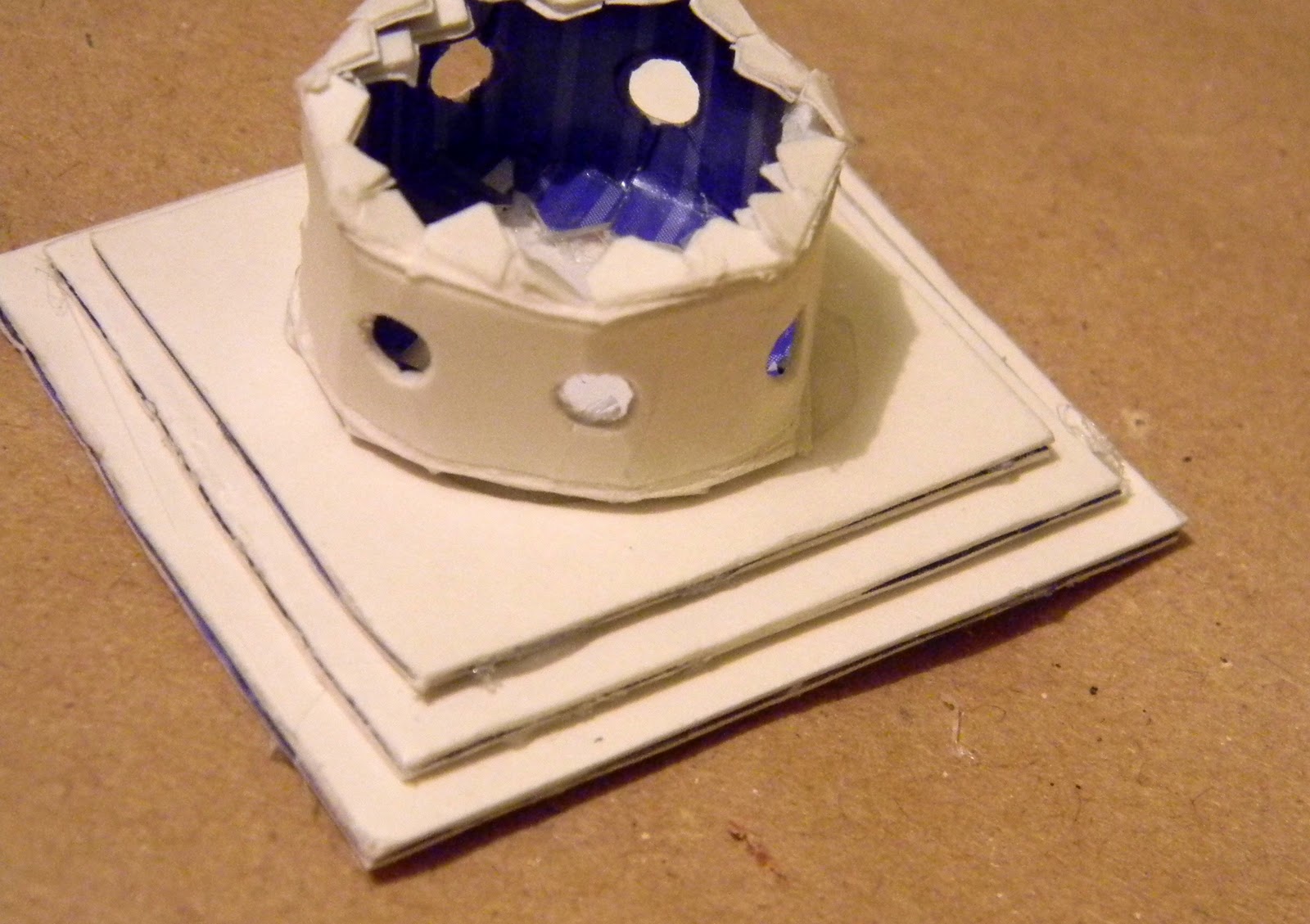 8. На заготовке круга делаем разрез по серединке до середины и делаем как бы полуконус, это будет верхушка воздуховода. Можно просто круг приклеить. Ckлеиваем все детали верха вместе, верха заготовку из квадратов разных размеров, воздуховода и верхушки воздуховода.