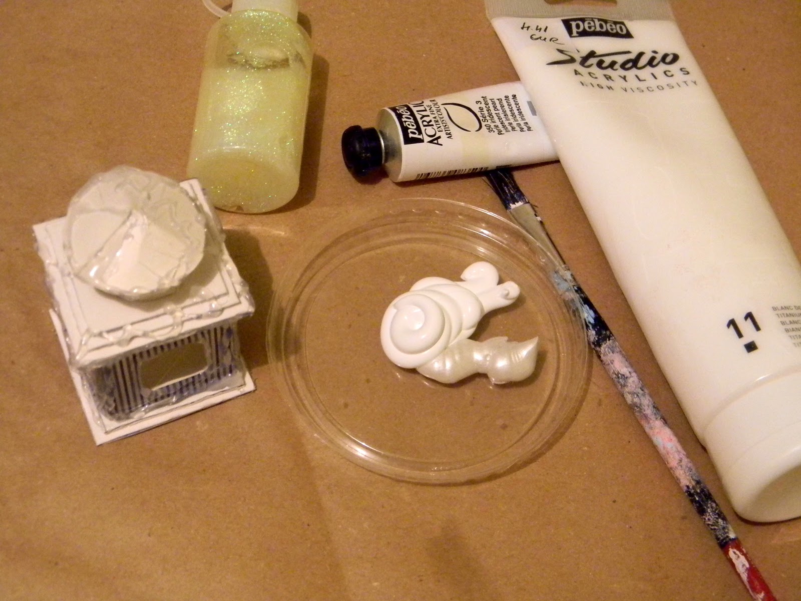 11. Когда термоклей высохнет/застынет, окрашиваю заготовку белой акриловой краской +перламутровая. Когда краска высохнет покрываю глиттером, или пока краска не высохла можно посыпать блёстками.