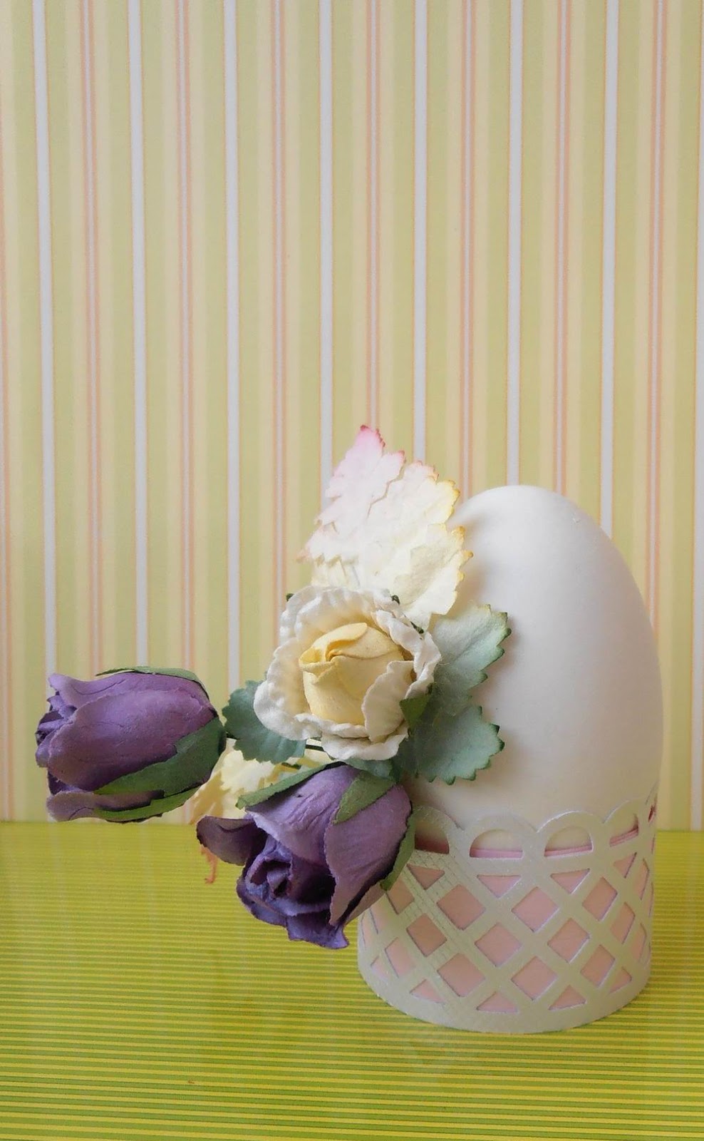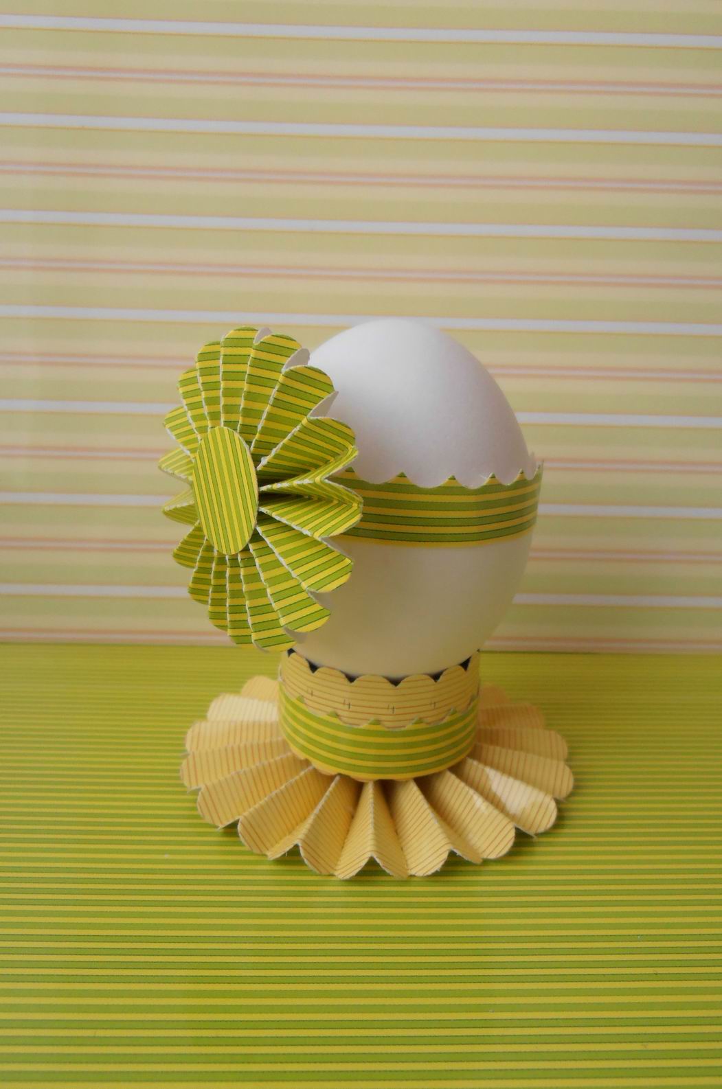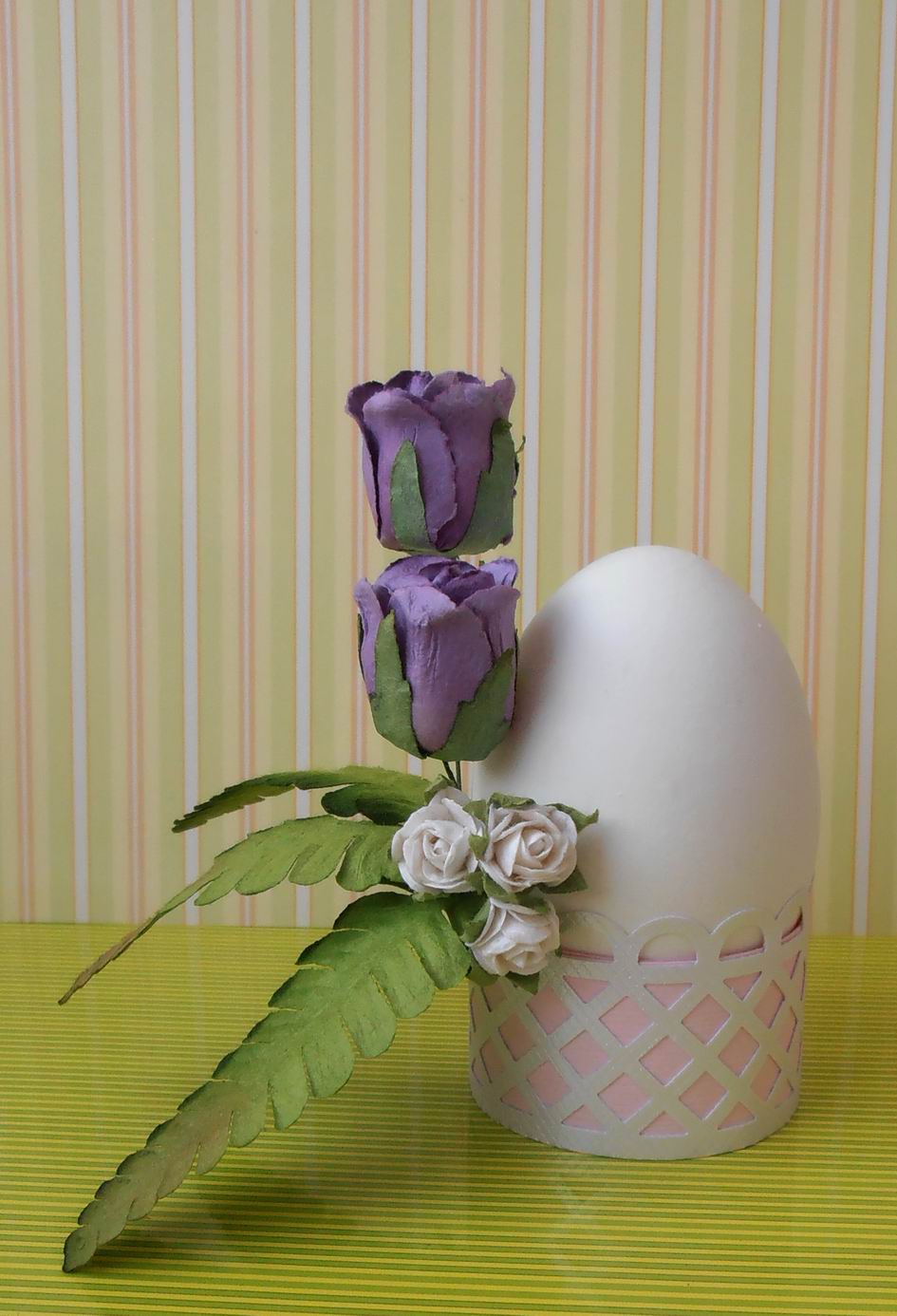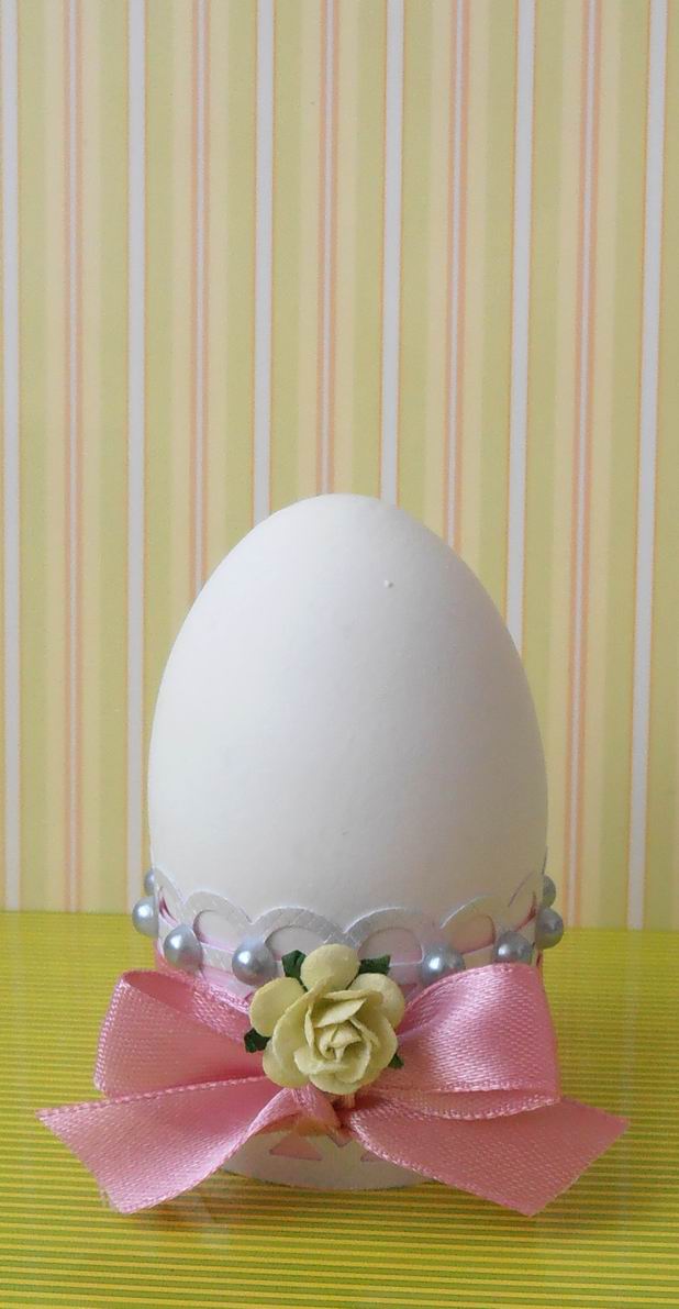 10. Наша подставка готова ! Даже белое яйцо выглядит празднично благодаря нежным тонам бумаги и лёгким украшениям.