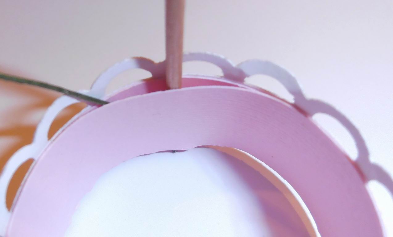 2. Скрепляем все три полоски в кольцо прочным клеем (или степлером, если этот край будет задекорирован лентой или кружевом), но только со стороны стыка, поскольку это важно для последующего декорирования. У нас получилось красивая ажурная подставка. Поскольку Пасха - праздник весенний, то главным украшением будут цветы. Измеряем длину стебельков, отрезаем лишнюю часть, аккуратно наносим на них клей, раздвигаем с помощью булавки (зубочистки или иглы) розовые кольца и осторожно помещаем между ними стебельки с клеем в произвольном порядке.