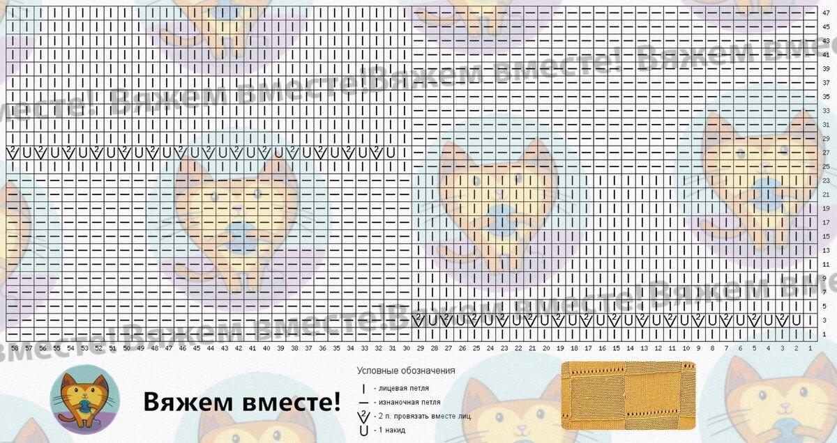 Схема узора представлена ниже. На ней дан один раппорт узора так, как он вяжется в верхней части изделия.