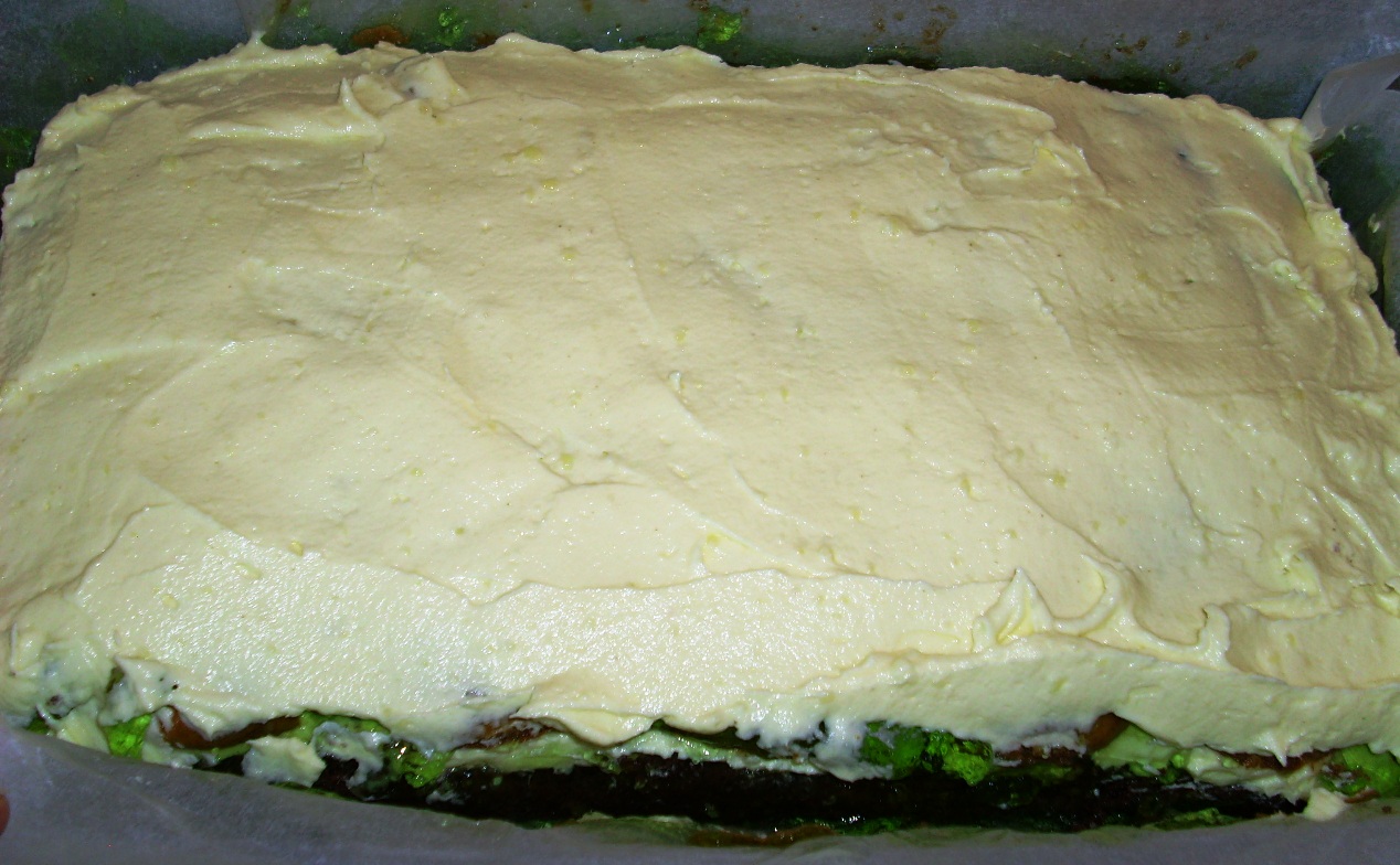 На печенье вылить желе.Поставить в холодильник на некоторое время, чтобы желе застыло. На олажденное желе положить остальной крем. Накрыть вторым коржом