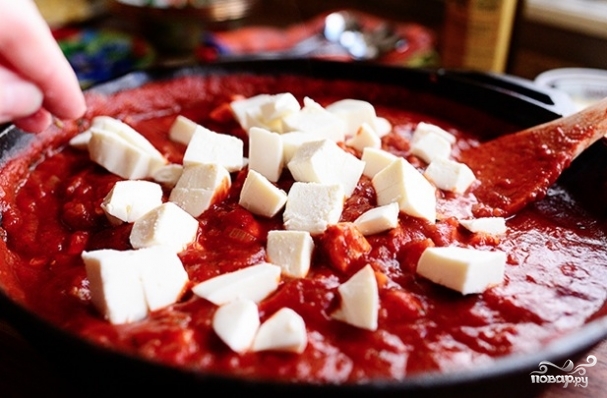 Добавляем кубиками нарезанную моцареллу. Перемешиваем и готовим еще пару минут.