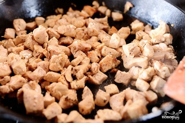 Куриное филе нарежьте на небольшие кусочки и обжарьте, посолив, на среднем огне в течение 3-4 минут. До образования небольшой корочки.