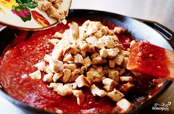 Добавляем томатный соус, слегка прогреваем его, после чего возвращаем в сковороду курицу. Добавляем свежую зелень и тушим 7-8 минут на среднем огне, помешивая.