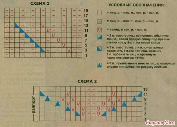 Узор № 1: вязать по схеме № 1, в изнаночных рядах петли и накиды вязать изнаночными;