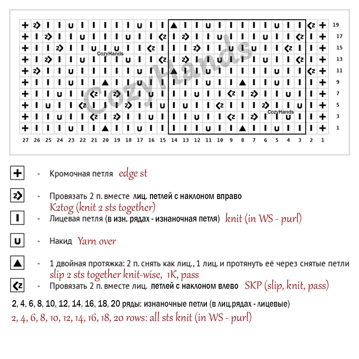 2, 4, 6, 8, 10, 12, 14, 16, 18, 20 ряд (изнаночный): кром.п., изнаночные петли, кром.п.