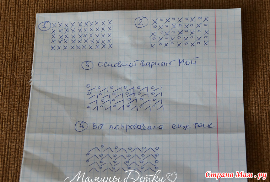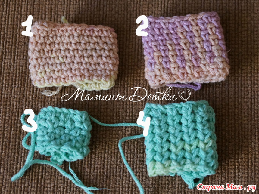 теперь давайте рассмотрим варианты рисунка, я связала четыре маленьких образца,