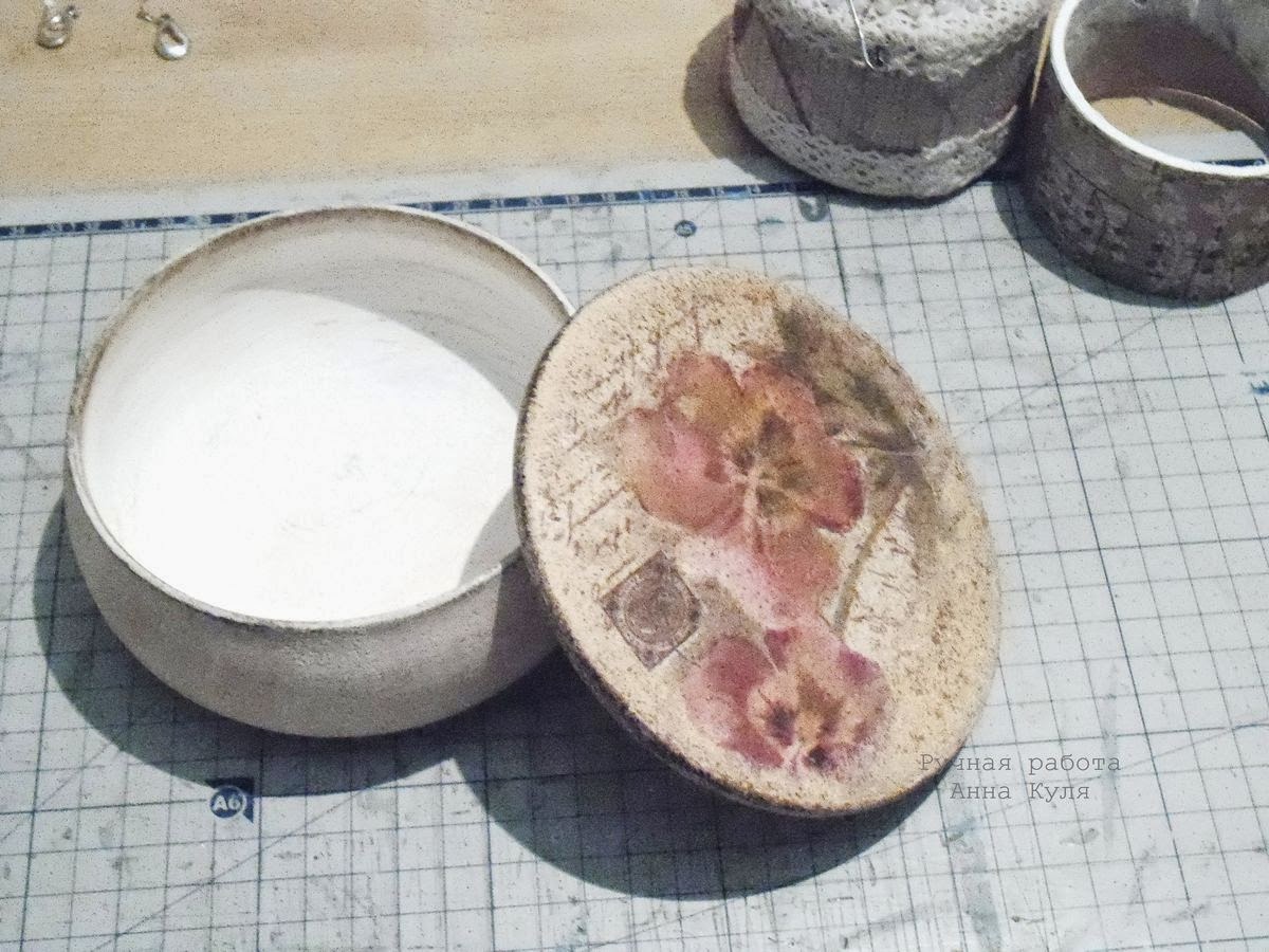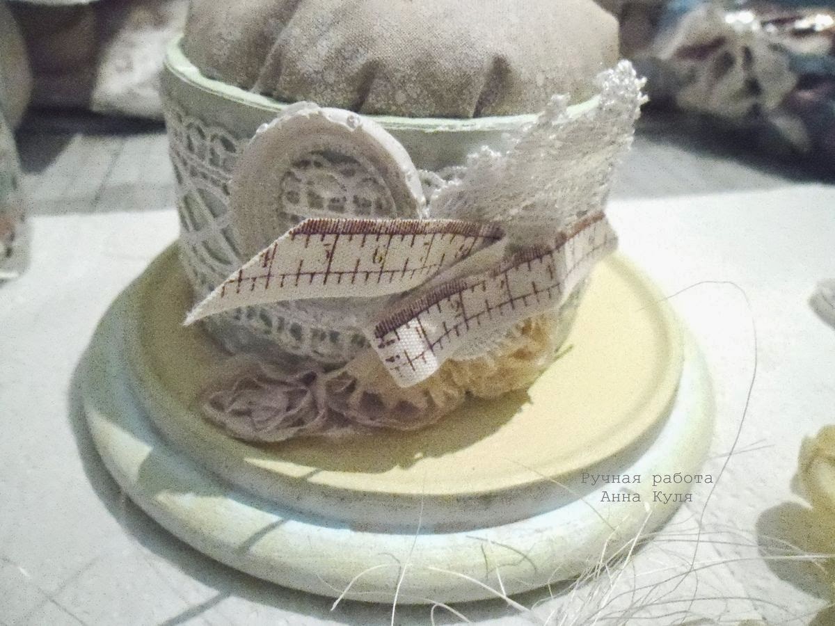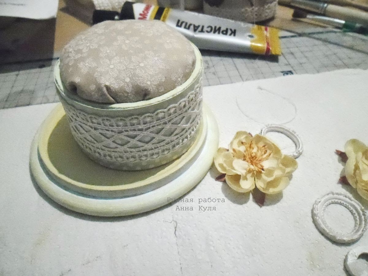 - и последний момент - основанием для моей игольницы послужила крышка от деревянной шкатулки. Несколько лет назад я пробовала свои силы в декупаже, такая заготовка - неудачный результат одной из моих проб) Недавно шкатулка попалась на глаза и я решила подарить ей вторую жизнь, но в ином качестве. Вы можете использовать в качестве основания все что угодно - крышки от баночек, ненужные тарелочки подходящего размера, спилы дерева....