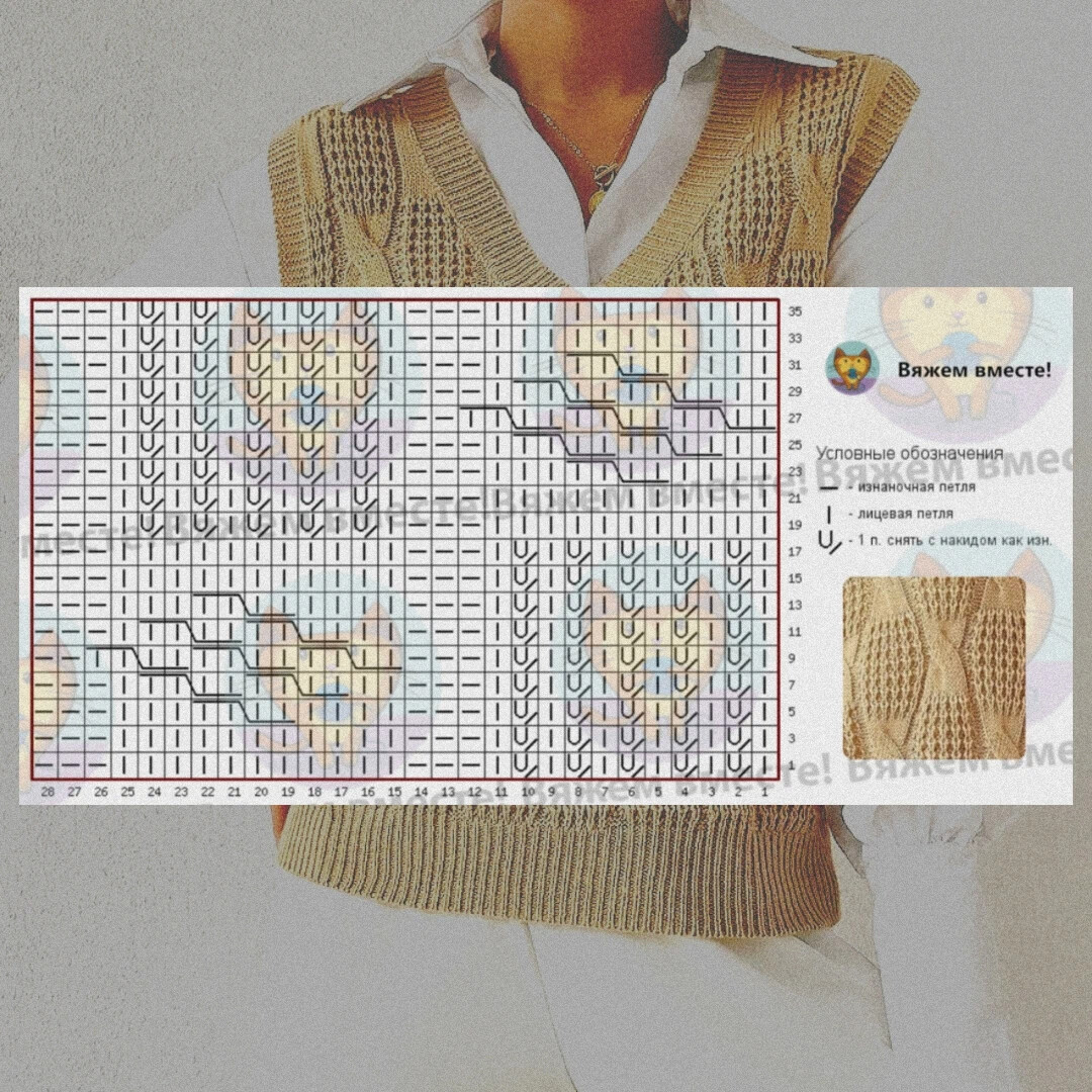 По схеме при вязании участков полупатентной резинки в лицевых нечётных рядах изнаночные петли переснимаются со спицы на спицу непровязаными + накид, лицевые вяжутся лицевыми. В изнаночных (чётных) рядах все петли провязываются так, как лежат на спице.