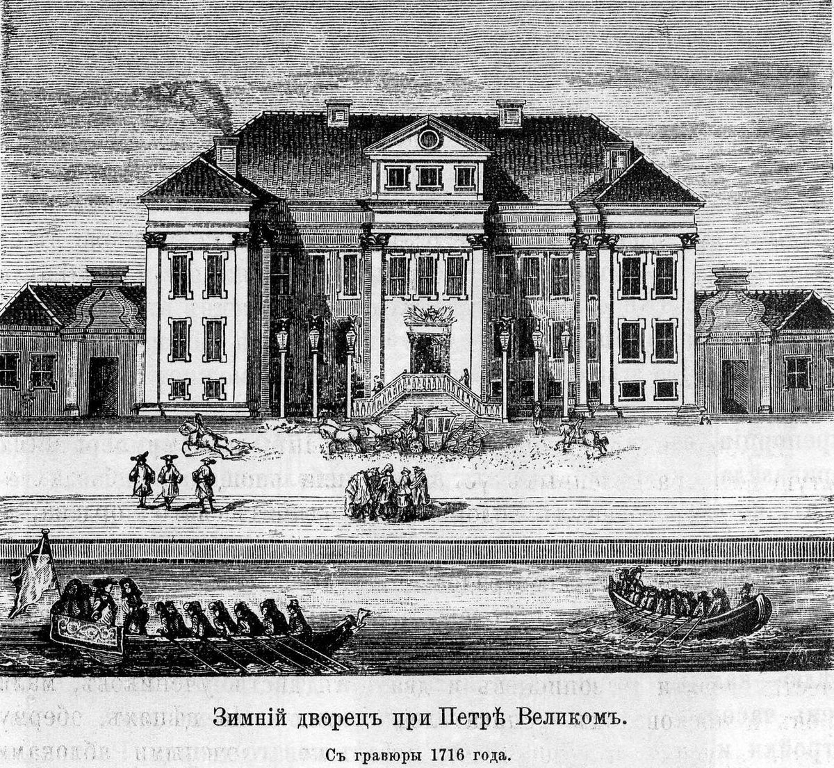 Первые четыре уличных фонаря, изготовленные на Ямбургском стекольном заводе, красовались на набережной Невы возле Петровского Зимнего дворца. Их установили ещё осенью 1720 года. На деревянных столбах с белыми и голубыми полосками крепились на металлических прутьях застекленные светильники. Горело в них конопляное масло.