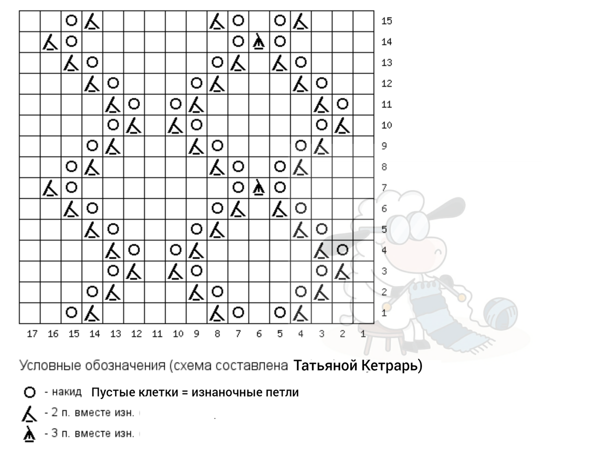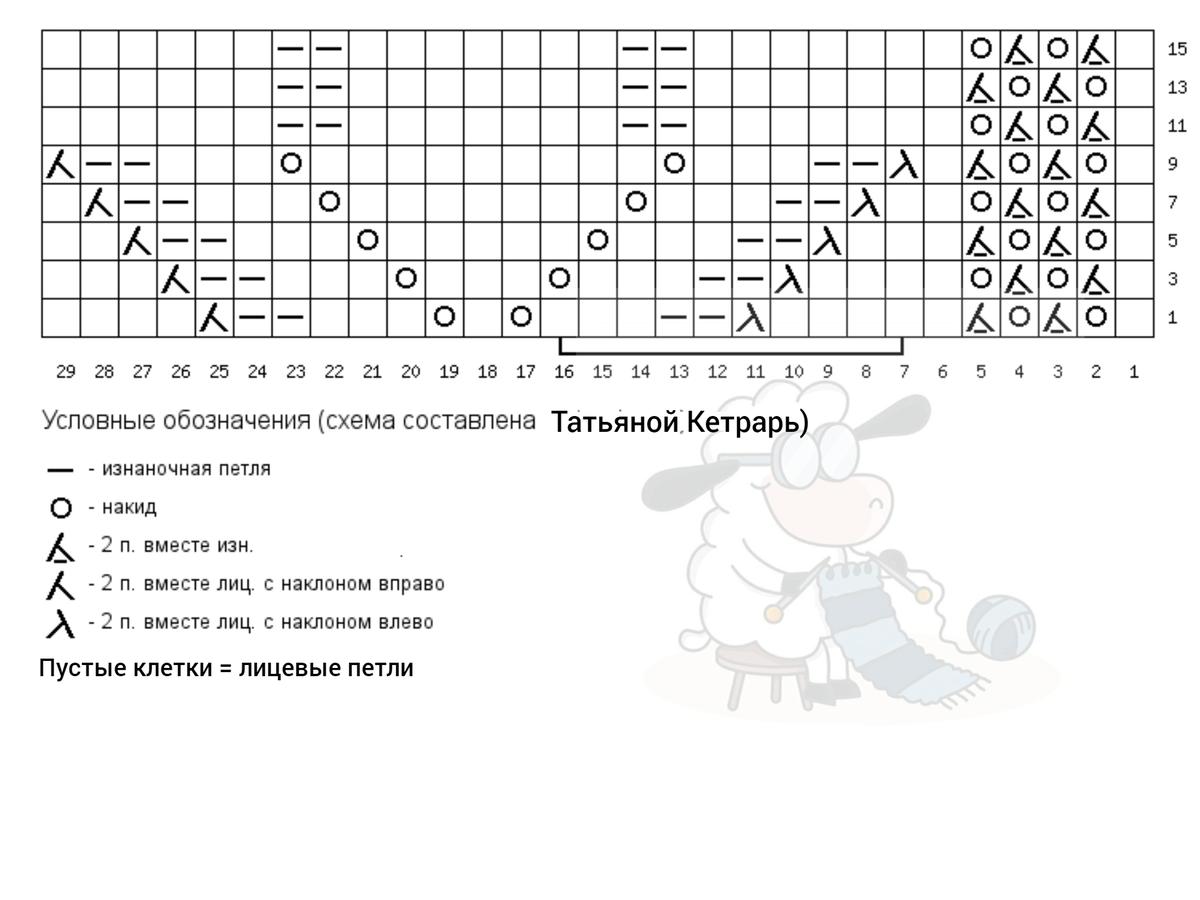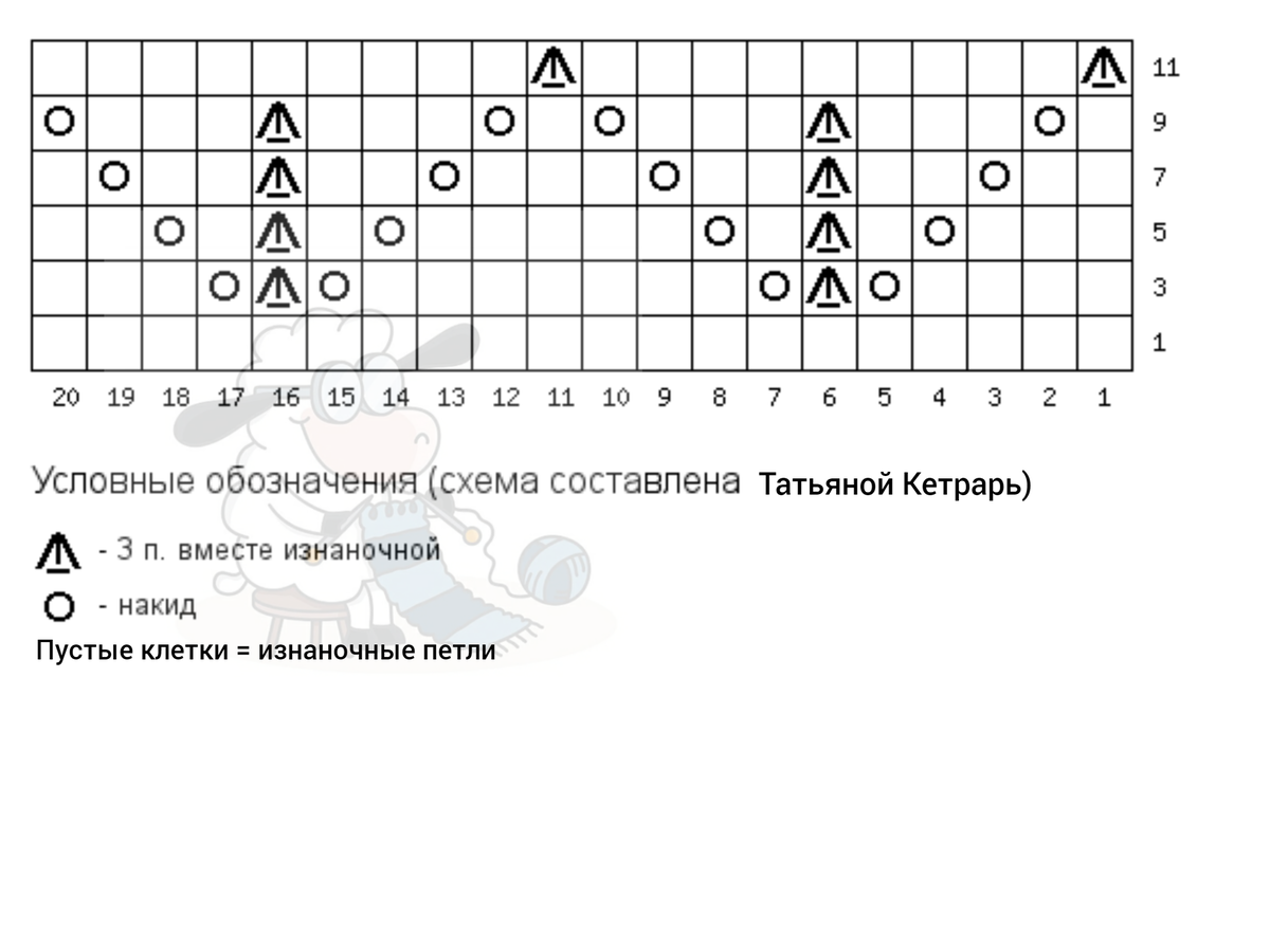 На схеме указаны только лицевые ряды (и обозначены правильно)). В изнаночных рядах все петли вязать по узору, накиды провязать изнаночными.