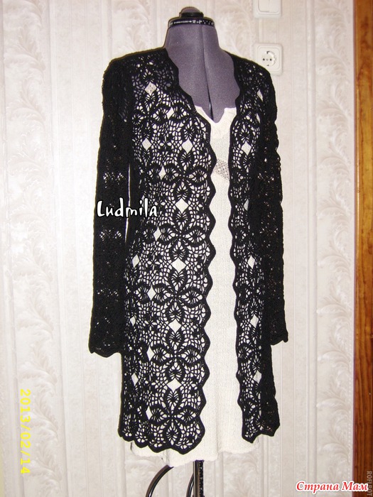 Кардиган ручной работы, выполнен крючком из отдельных мотивов. С V-образным вырезом горловины. Волнистой отделкой по всему краю. Пряжа 100% хлопок АННА-S 100г=500м. Длина 90см.