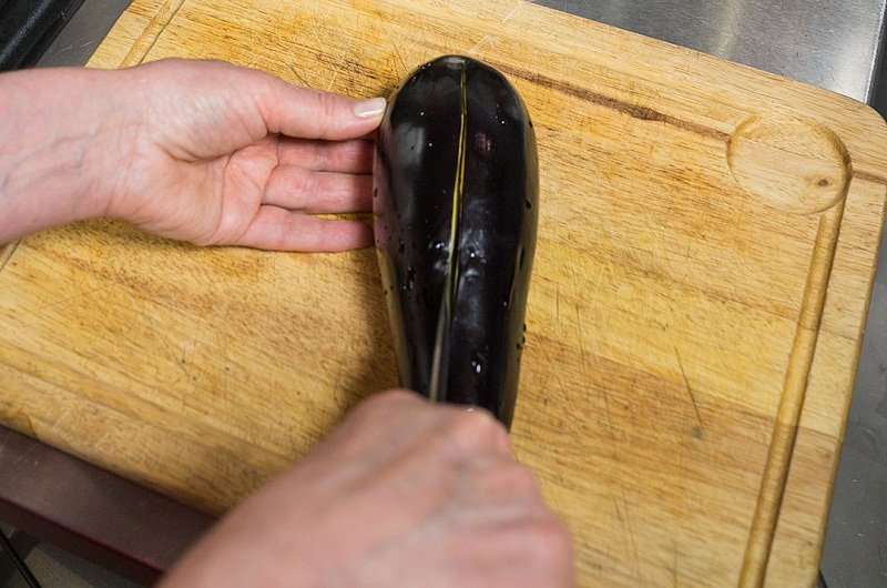 Вымойте баклажаны и очистите их от плодоножек. В центре каждого баклажана сделайте продольный надрез.