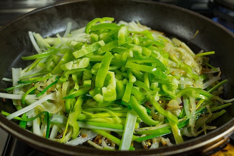 Обжарьте в сковороде на подсолнечном масле лук до золотистости, добавьте семена кориандра, затем поместите в сковороду лук-порей и болгарский перец, хорошенько всё перемешайте.