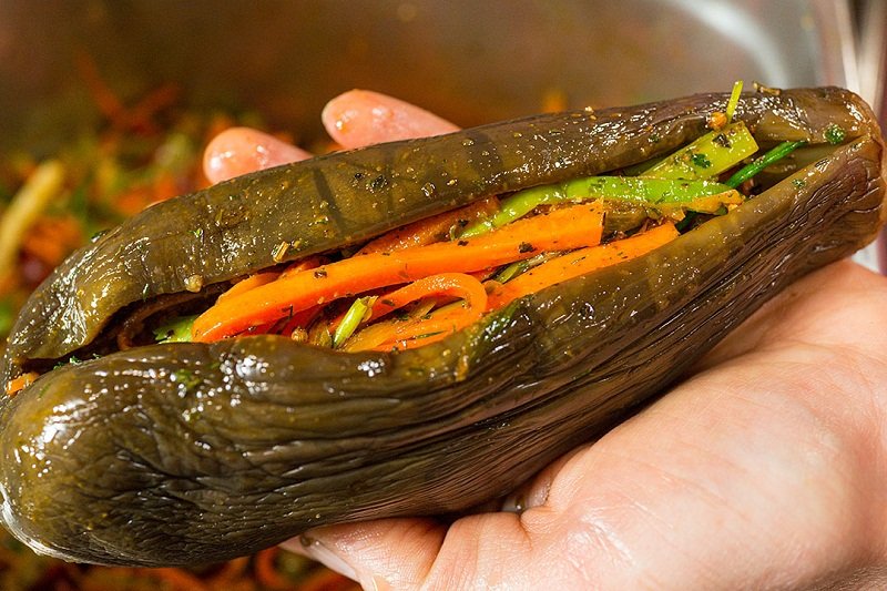 Сегодня мы поделимся с вами одним из самых удачных рецептов приготовления синеньких. Маринованные фаршированные баклажаны с морковью, болгарским перцем и луком-пореем — настоящая находка для хозяек. Такой закуской можно угостить даже худеющих и вегетарианцев, поскольку в ее состав входят только овощи и зелень. Не поленитесь, приготовьте эту вкуснятину вместе с нами!