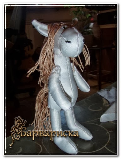 Росту в ней всего 12см, с ушками 13)) А вышло так, что шила я большую девочку и вдруг...запорола голову, вернее я так близко обрезала швы, что после тонирования они расползлись...Буду переделывать...А пока наткнулась на совсем уж мелкие такие обрезки стрейчевого атласа и решила попробовать сделать вот такую малышку!
