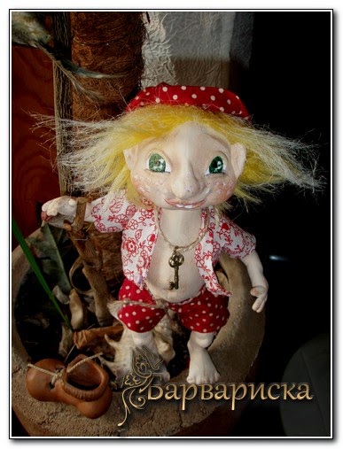 Он наконец-таки родился)) Знакомьтесь - домовёнок Кузька. Росточком 20 см,куколка каркасная, голова на шариковом шарнире, вся подвижная)) материал - грунтованный ...трикотаж. Первый раз попробовала работать с таким материалом..интересно, конечно, но с грунтовкой помучилась.