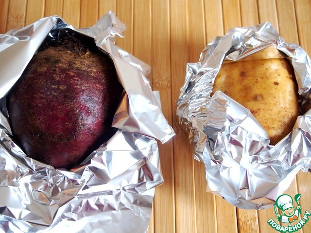 Крупную свеклу и картошку хорошо помыть, завернуть в фольгу. Запекать в духовке, заранее разогретой до 220 гр. Картошка у меня запекалась 45 минут, а свекла, примерно, 1 час 10 мин. Проверить готовность, проткнув овощи ножом. |