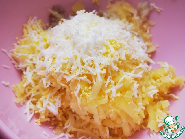 В миску выложить измельченную селёдку и лук. К ним добавить яйцо, натертое на мелкой терке и картошку, натертую на крупной терке. |