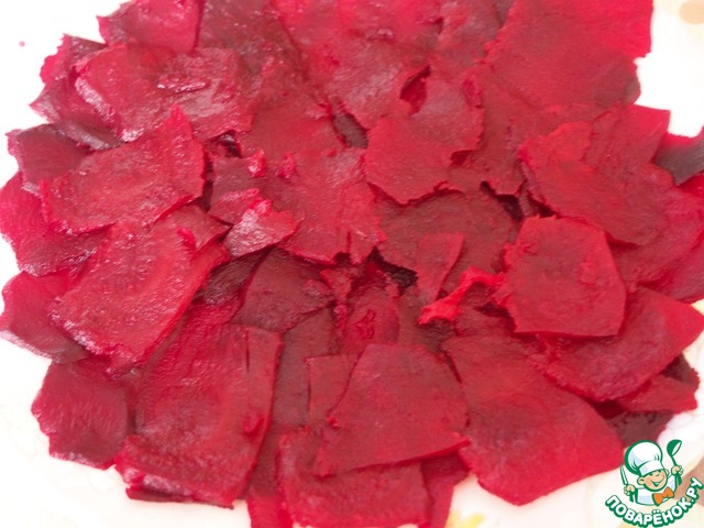 Остывшую свеклу почистить и нарезать на тонкие полосочки, с помощью овощечистки. |