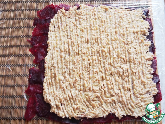 Сверху распределить форшмак. Для удобства, я переложила форшмак в целлофановый пакет, отрезала уголочек и выдавливала на свеклу. |