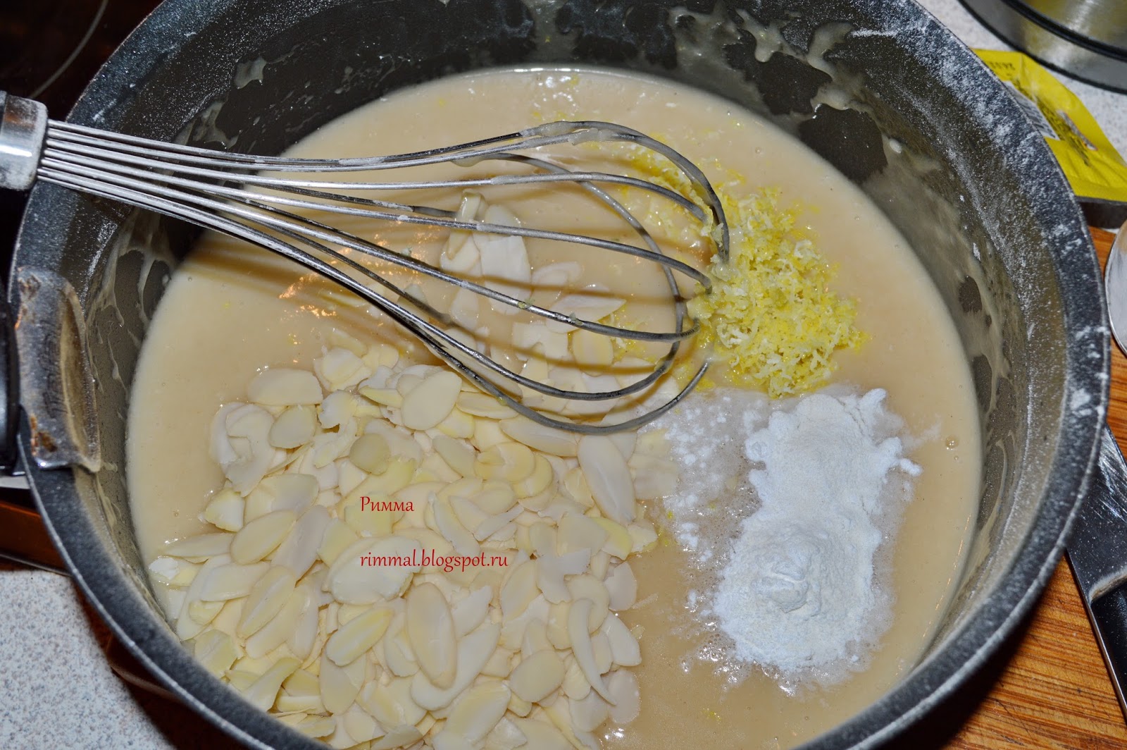 Затем добавляем разрыхлитель, лимонную цедру и миндальные лепестки. Тщательно перемешиваем, чтобы не было комочков. Тесто должно напоминать густую сметану.