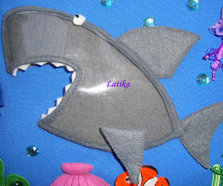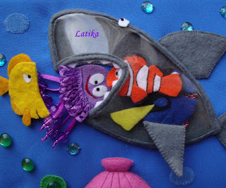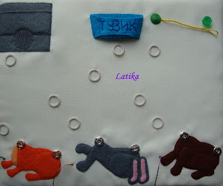 Задачи странички: научится пользоваться пуговицами (широкие водоросли на пуговках), научится шнуровать (узкие водоросли на бисерных петельках), понять что значит большой, средний маленький - тоже с помощью водорослей. Научиться пользоваться кнопочками (раковина с жемчужиной) и карманами (акула). Кроме того на страничку нашит декор под пузырики воды ну и песок-бисер, который можно пощупать - не оторвется. Ну и просто играть с кучей морских обитателей, которые крепятся к страничкам с помощью липучек.