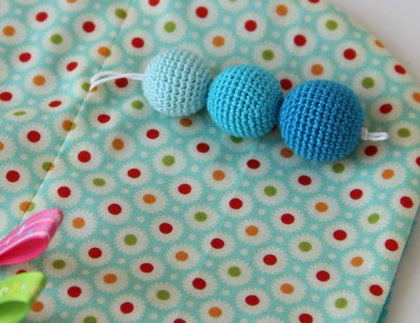 Пришьем на изделие ленту с кнопкой, на нее можно надеть игрушку, которую любит ваш ребенок. Косую бейку (30,5 см длиной) отстрочите в край, сложив пополам и заложив концы внутрь. Один конец пришить к нагрудничку, подвернув край внутрь и пришив верхнюю деталь кнопки, ко второму пришить нижнюю деталь кнопки. На образовавшийся крючок повесить игрушку. Кнопку застегнуть.
