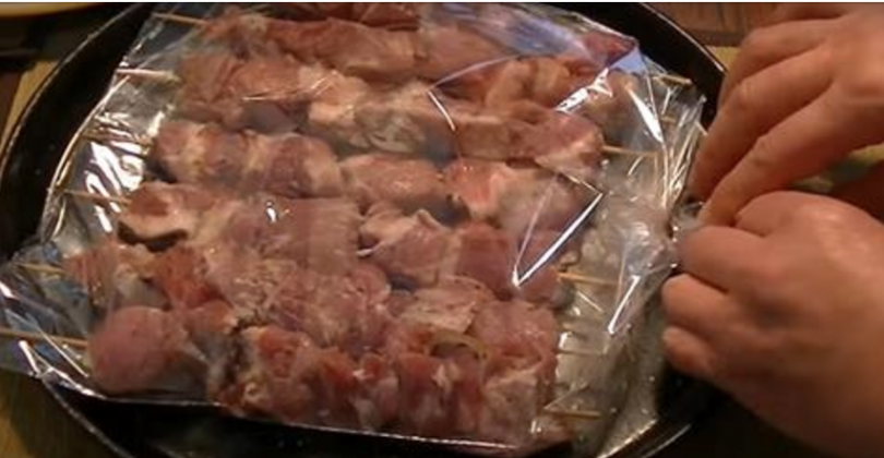 6. Возьмите рукав для запекания и поместите в него шпажки с мясом. Укладывайте шашлык в ряд, чтобы дать ему возможность равномерно прожариться со всех сторон.