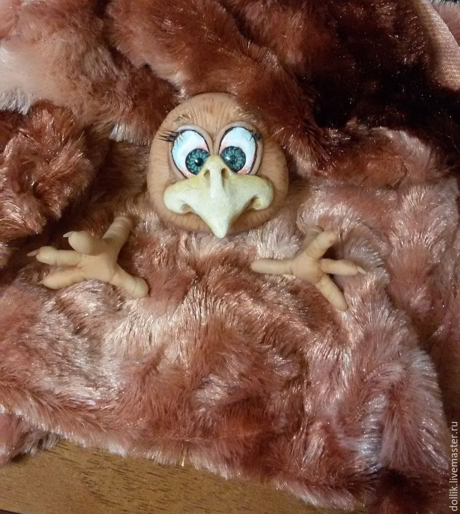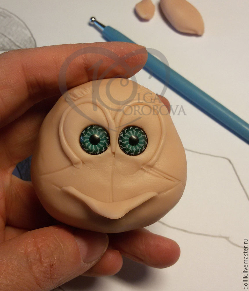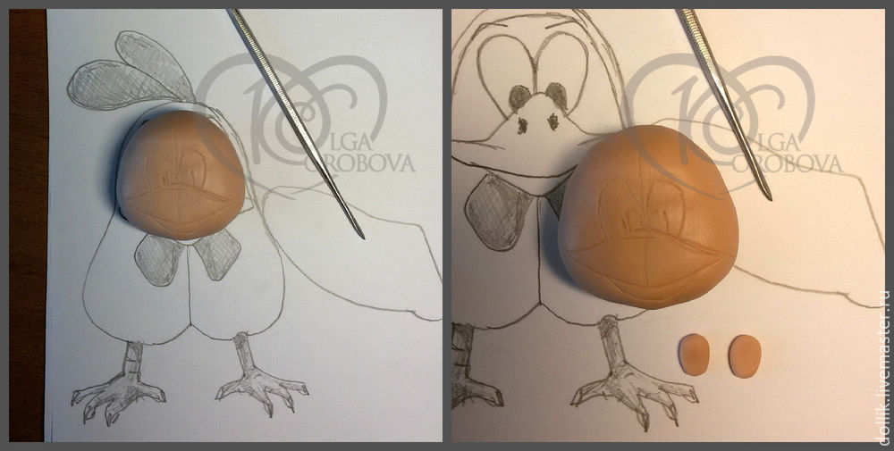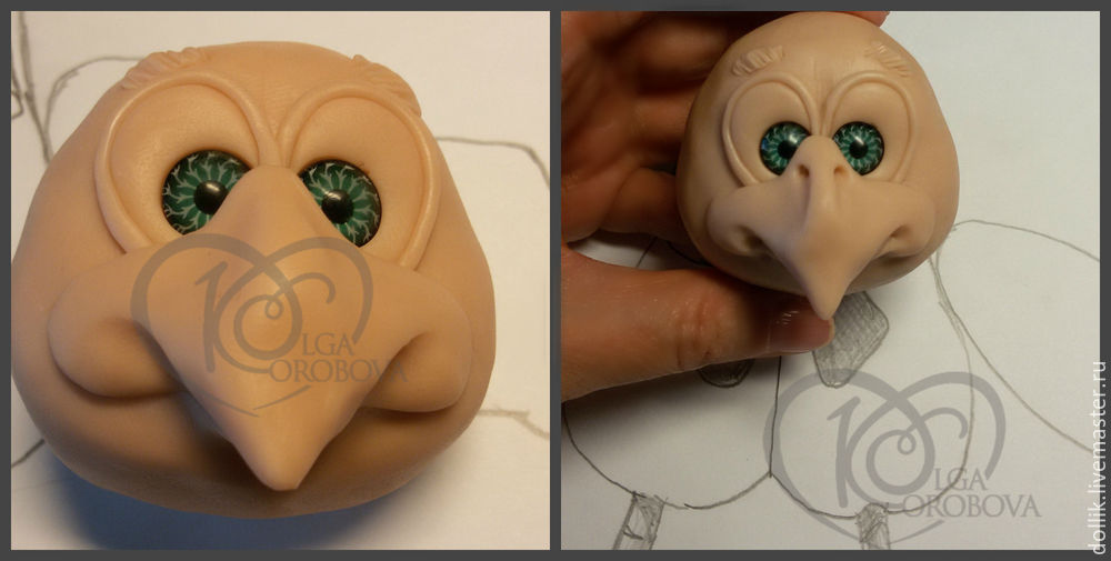 Далее берем шило и начинаем имитировать волоски-перышки. Слегка надавливая на пластик, делаем короткие углубления разного размера, начиная от клюва и продолжая линии к макушке и горлышку. Ставим запекать мордочку на 30 минут при t 110. В зависимости от пластика, который будет у вас, время обжига может измениться. Читайте инструкцию на упаковке.